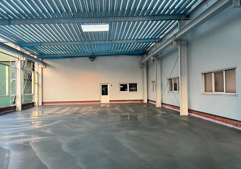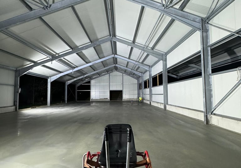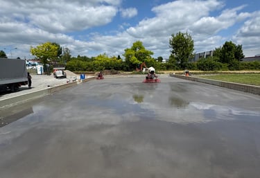 Herstellung von Bodenplatten mit Glättung für neue Hallenprojekte.